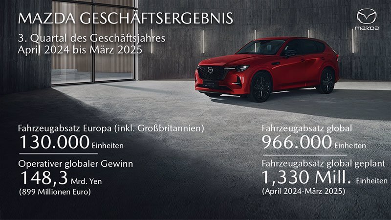 Die Mazda Motor Corporation hat heute ihre Finanz- und Absatzzahlen für die ersten drei Quartale ihres am 31. März 2025 zu Ende gehenden Geschäftsjahres bekannt gegeben. Vom 1. April bis 31. Dezember 2024 hat der japanische Automobilhersteller weltweit einen Absatz von 966.000 Fahrzeugen erreicht. Dies entspricht einem Plus von vier Prozent zum Vorjahr.